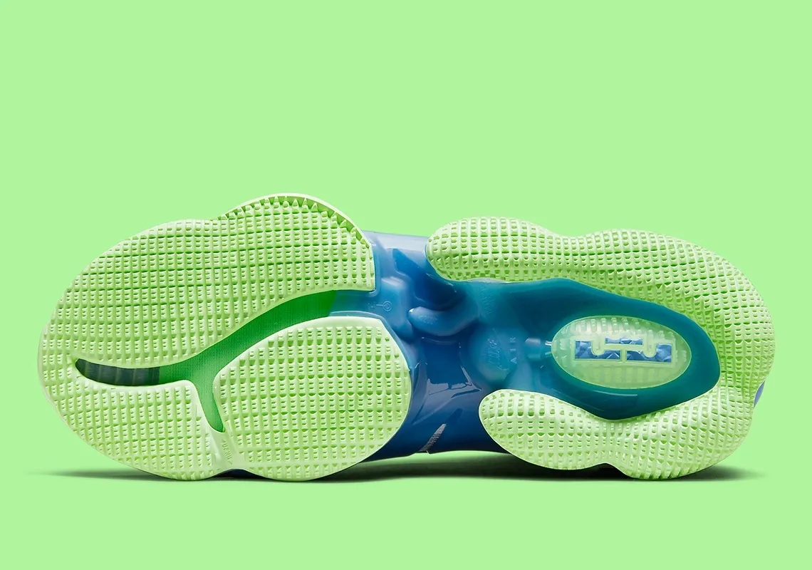 On y retrouve une tige en blanc, recouverte par une bande en bleu-clair, de la même couleur que la languette et la semelle intermédiaire. Les lacets et la semelle extérieure ressortent pour leur part en vert pomme, tandis que l'intérieur (et les contours) de la languette ainsi que du col apparaissent en rose.