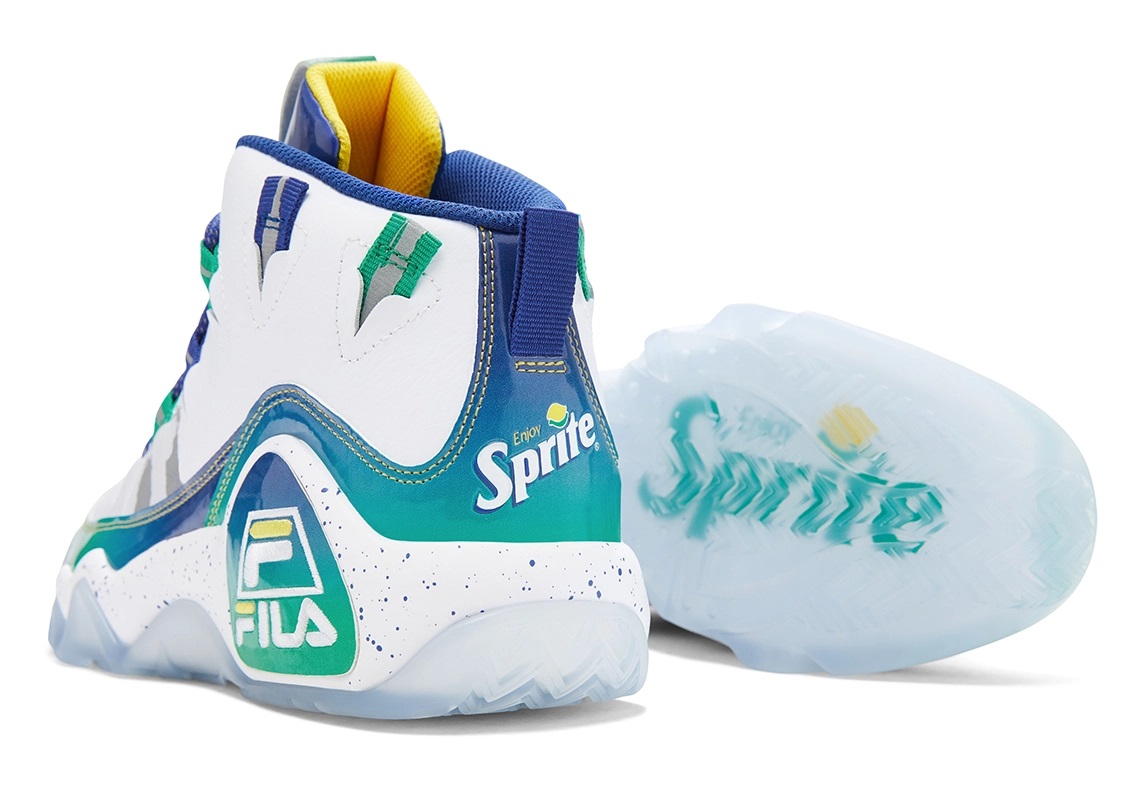 Cette Grant Hill 1 est recouverte de la palette de couleurs des canettes Sprite des années 90 avec un dégradé allant du vert au violet, utilisé pour la languette, le bas de la tige, majoritairement blanche, le talon et les œillets. On retrouve le même dégradé, de haut en bas cette fois, pour faire ressortir le logo Fila sur la semelle intermédiaire. Le reste de la semelle est moucheté pour illustrer l’aspect pétillant de la paire. Le logo Sprite figure pour sa part sur le talon et sous la chaussure.