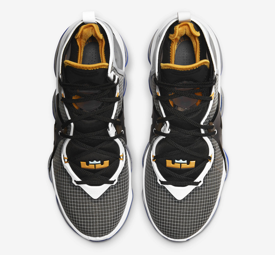 La tige en textile synthétique s’affiche en noir et blanc sur un motif quadrillé, et reste recouverte d’une bande en TPU noir. Des teintes dorées sont visibles sur les contours de la languette, où figure également le logo du King, et l’intérieur du col. La semelle extérieure ressort pour sa part en bleu marine.