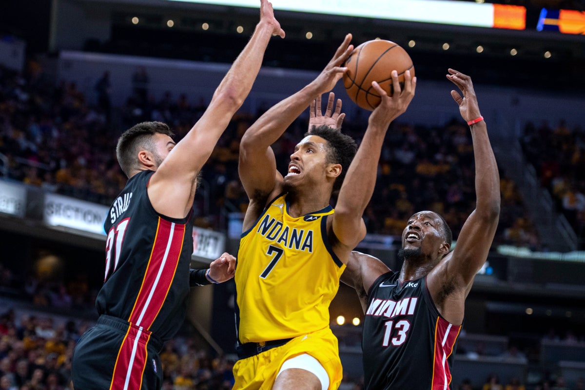 Les locaux ont pris l’ascendant en fin de premier quart-temps sur un dunk tout cuit de Domantas Sabonis (17-15). L’arrivée de Tyler Herro sur le parquet a relancé le Heat mais Indiana a ensuite affiché sa maîtrise, peu avant la pause suite à des bons passages de Jeremy Lamb et d’Oshae Brissett (47-35).