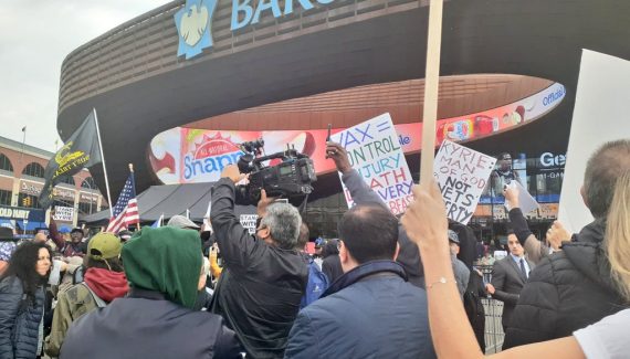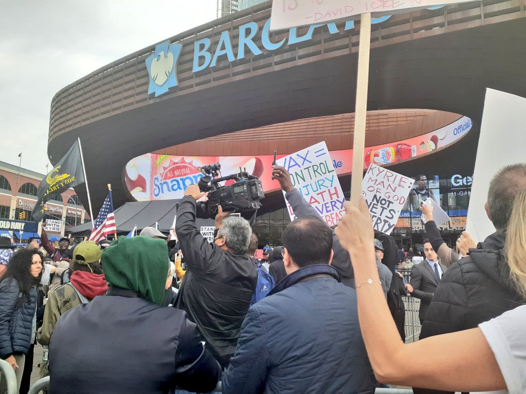 Alors que le match va débuter à 22h00, des dizaines de manifestants opposés à l’obligation vaccinale contre le Covid-19 imposée par New York s’étaient ainsi réunis devant l’enceinte, en criant de “Laissez Kyrie jouer”.