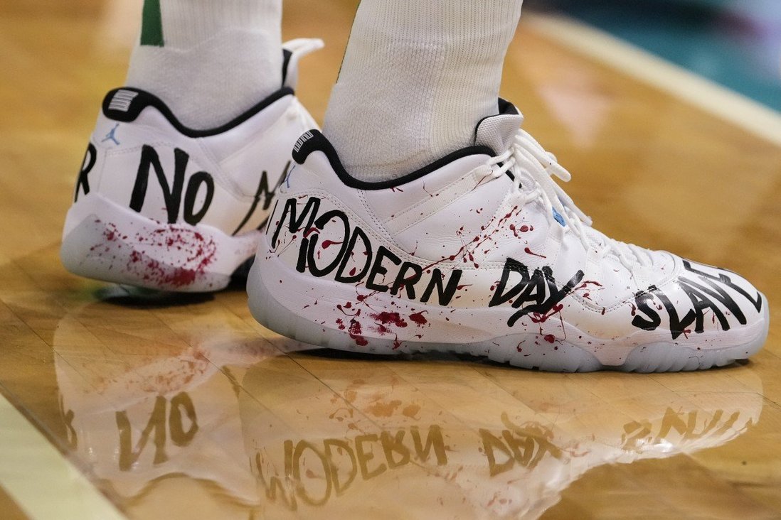 Les chaussures d’Enes Kanter étaient couvertes de fausses gouttes de sang, accompagnées du message “Esclavage des temps modernes”, alors qu’il demande à Nike si ses chaussures sont produites dans les usines du Xinjiang, où la Chine mène une répression féroce contre la communauté musulmane ouïgoure, dont plus d’un million de membres seraient dans des “camps d’internement et de rééducation”, en étant soumis à du travail forcé.