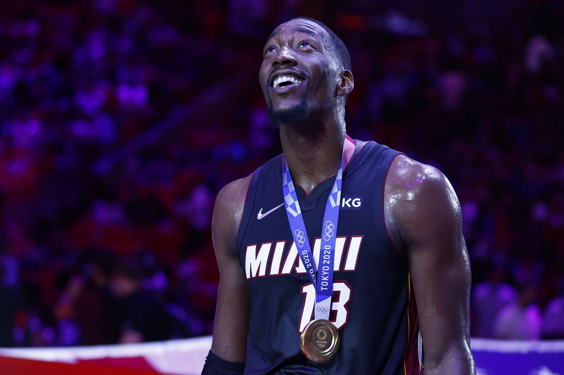 Au plafond de la FTX Arena, nouveau nom de la salle du Heat, on trouve les maillots retirés des anciennes gloires de la franchise, celui de Michael Jordan, mais aussi les bannières des champions olympiques sous les couleurs de Miami. Cette nuit avait ainsi lieu la cérémonie du retrait de la bannière de Bam Adebayo, médaillé d’or aux Jeux olympiques de Tokyo cet été, et le voilà désormais placé à la droite de Dwyane Wade et LeBron James.