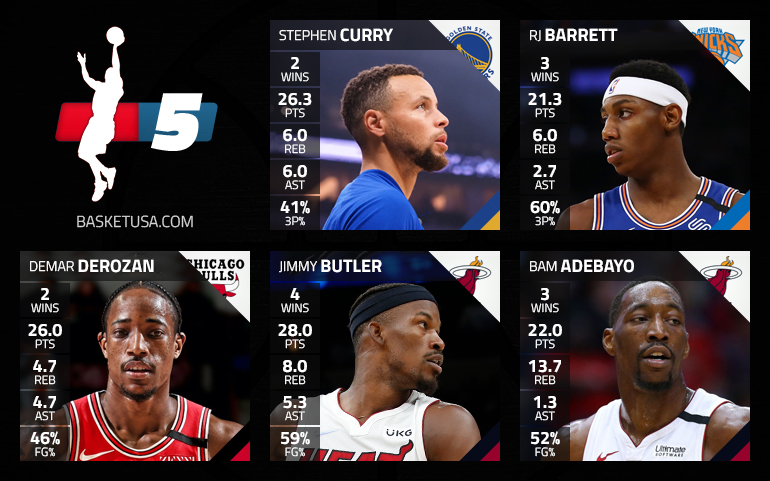 On joue donc assez petit avec DeMar DeRozan et Jimmy Butler sur les ailes. Malgré les candidatures de Kevin Durant, Miles Bridges, Anthony Davis ou encore Tobias Harris, ces deux choix-là ont été plus simples, en particulier celui du leader de Miami, avec son bilan parfait de quatre victoires en quatre sorties.
