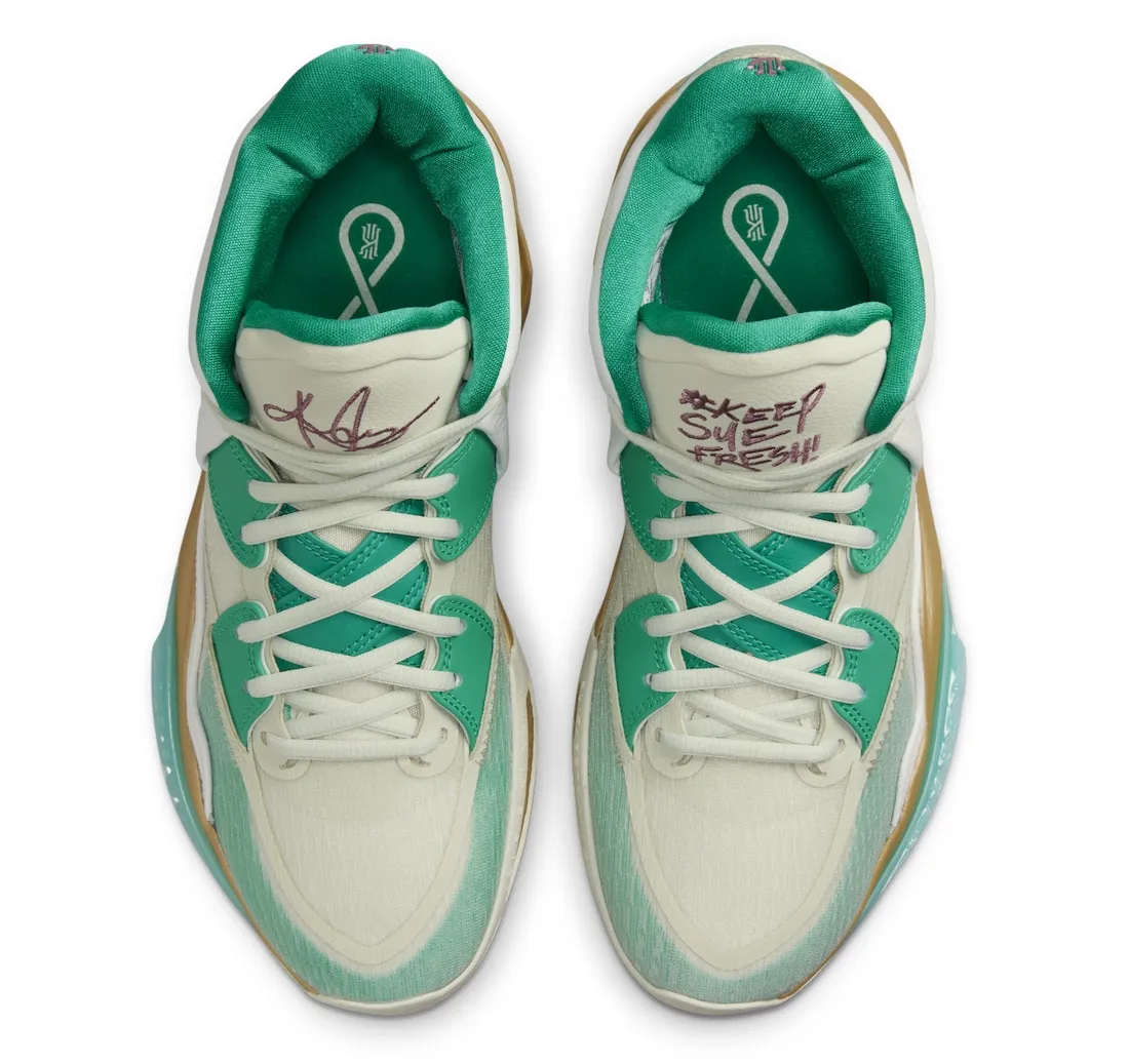 Le Hashtag #KeepSueFresh apparaît en violet sur la languette de la chaussure gauche, couleur que l’on retrouve également sur le logo de Kyrie Irving, au niveau du talon. L’ensemble est complété par une semelle intermédiaire dorée, tandis que la semelle extérieure est en caoutchouc blanc cassé.