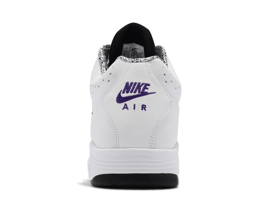 L’intérieur du col est en imprimé éléphant, alors qu’on retrouve le logo Nike Air cousu sur le talon en violet. La semelle intermédiaire blanche et la semelle extérieure noire et blanche complètent l’ensemble.