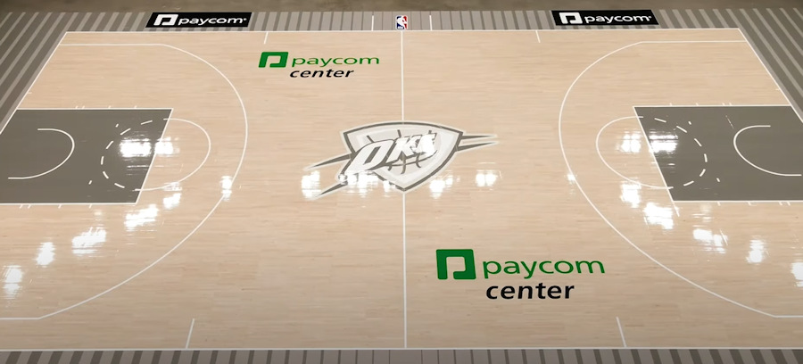 Alors que le maillot de l’an passé était très coloré, le Thunder a opté cette saison pour un maillot ultra-sobre, blanc et gris ! Et le parquet en reprend donc le concept.