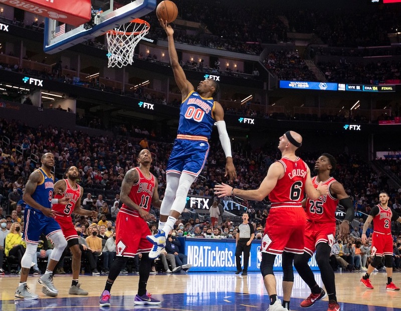 Le rookie, qui a disposé de son plus gros temps de jeu (7 points et 6 rebonds en 19 minutes) cette nuit face aux Nets, impressionne avec ce genre d’actions au-dessus du cercle. Il s’était déjà démarqué y a quelques jours contre les Bulls. Steve Kerr avait notamment apprécié son travail défensif sur DeMar DeRozan.