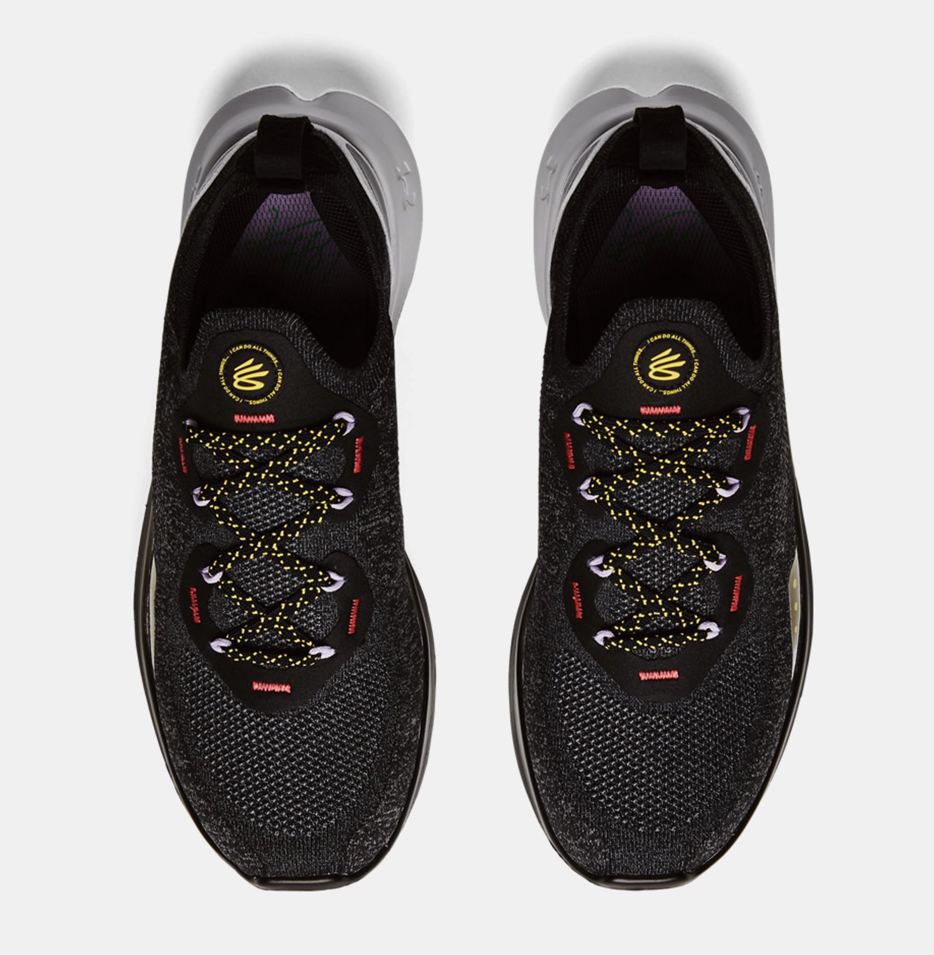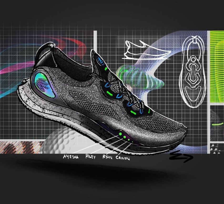 Présentée par Nick DePaula, la Curry Flow Go, dessinée par le designer Ed Wallace se présente avec une base noire reposant sur une semelle blanche, et des teintes de jaune, comme sur les quatre points à l’avant de la chaussure, qui représentent la famille de Stephen Curry, ou le logo du joueur.