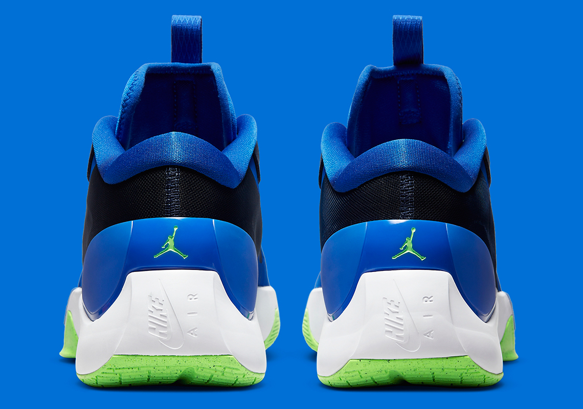 La tige est majoritairement bleu, avec des bandes noires à l’avant et à l’arrière de la chaussure. La semelle extérieure s’affiche dans un vert éclatant, tout comme le logo Jordan présent sur la languette et le talon.