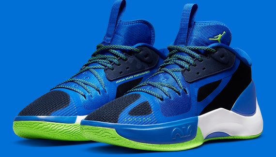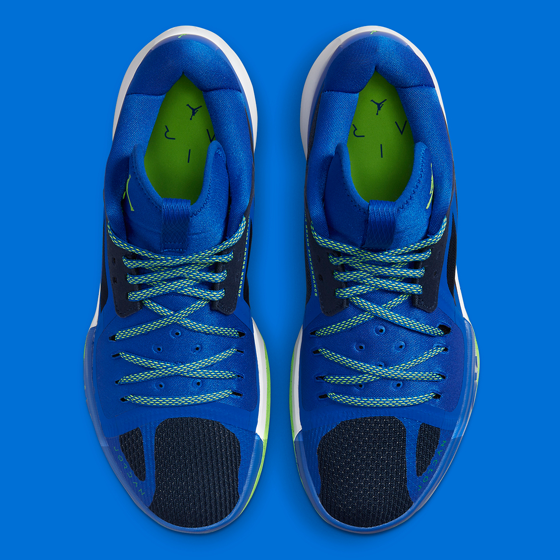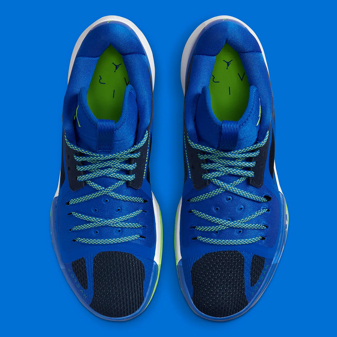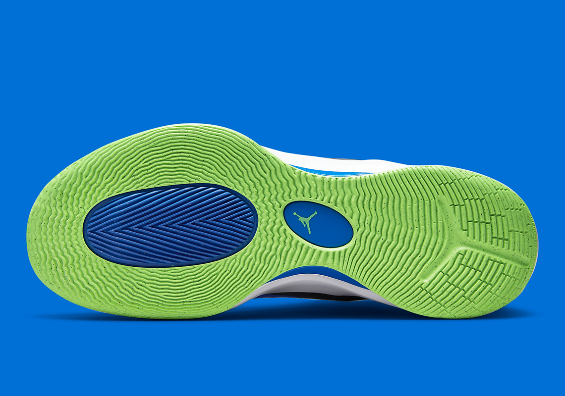 La tige est majoritairement bleu, avec des bandes noires à l’avant et à l’arrière de la chaussure. La semelle extérieure s’affiche dans un vert éclatant, tout comme le logo Jordan présent sur la languette et le talon.