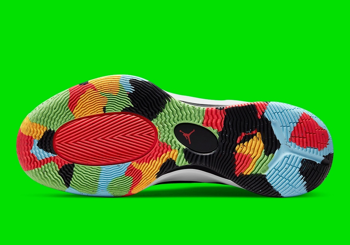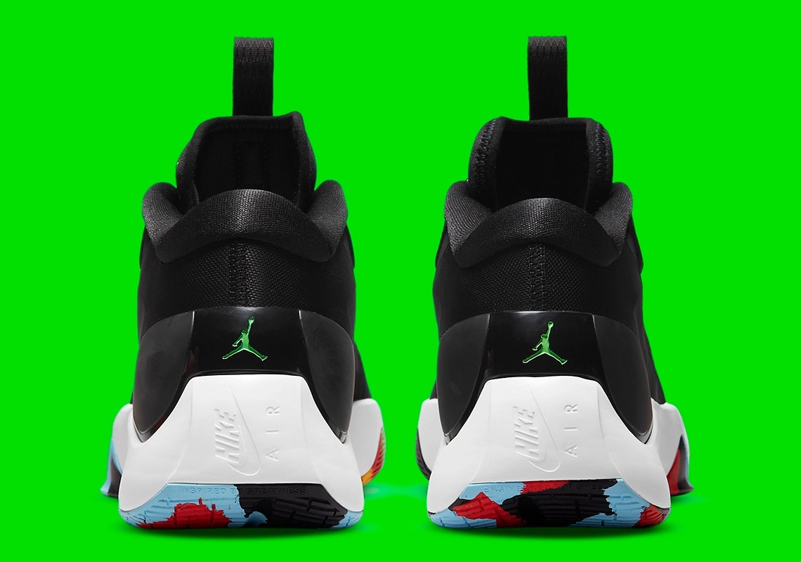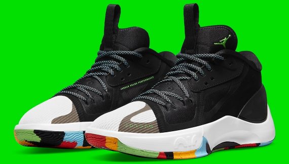 Après une première version classique, puis un coloris en hommage aux couleurs historiques des Mavs, la Jordan Zoom Separate va se doter d’un modèle alliant sobriété avec une tige noire grise et blanche et une touche de folie avec une semelle multicolore. Le « Jumpman » apparaît en vert sur la languette et le talon.