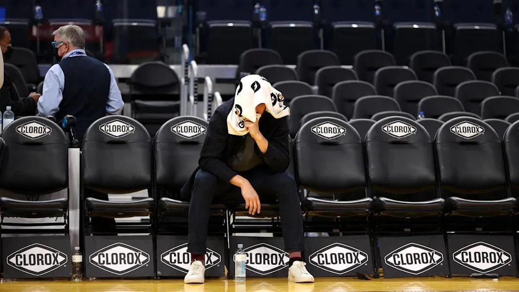 La séquence dure près d'une minute. Klay Thompson est seul sur le banc des Warriors, la tête enfouie sous une serviette. Et puis, soudain, il s'essuie les yeux et le visage. Un gros coup de blues pour le shooteur des Warriors alors qu'il vient de recevoir le feu vert des médecins pour reprendre l'entraînement avec le reste du groupe.