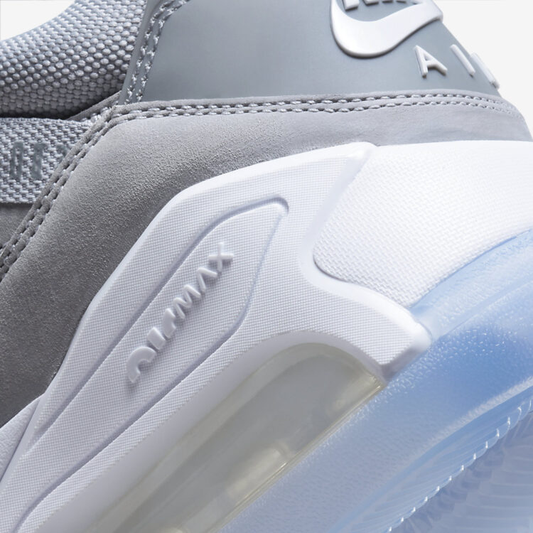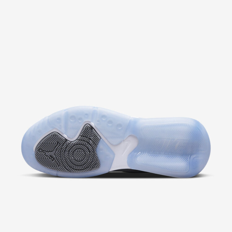 Le Jumpman apparaît sur la languette tandis que le « Nike Air » avec la virgule ressort sur le talon. La semelle intermédiaire blanche repose sur extérieure en bleu glacé.