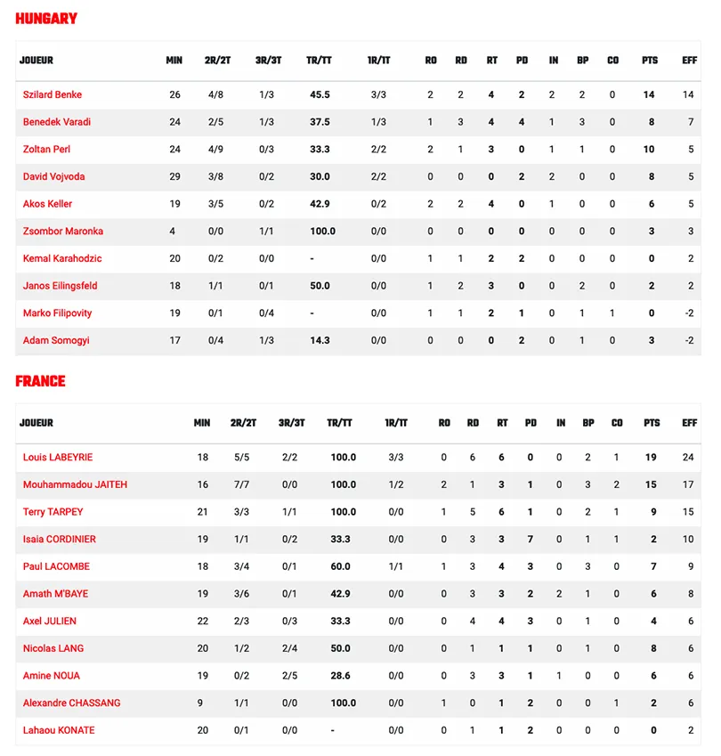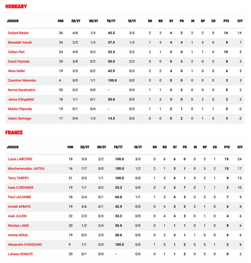 Néanmoins, les Bleus de Vincent Collet ont fait le job. Après leur victoire compliquée face au Monténégro à Pau, ils ont ainsi tranquillement dominé la Hongrie à Kaposvar (78-54), derrière un Louis Labeyrie parfait (19 points à 7/7 au tir), tout comme Mam Jaiteh (15 points à 7/7 également).