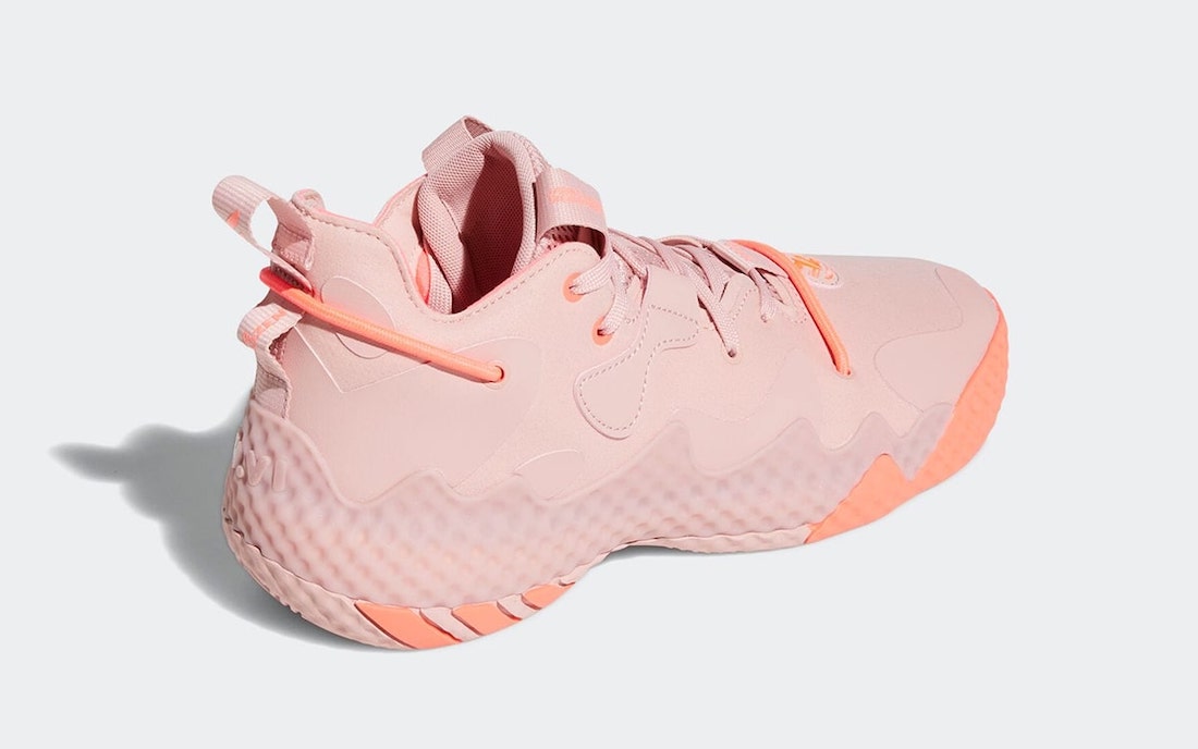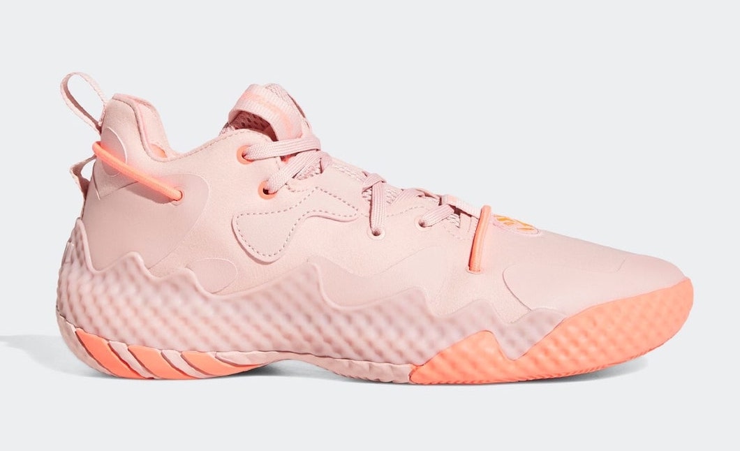 La marque aux trois bandes s’apprête à mettre le paquet sur la Harden Vol. 6, déjà dévoilée en deux coloris et qui va rapidement être accompagnée par cette version « saumon », alliant du rose pâle, principalement sur la tige en mesh et en cuir, et des marques d’orange au niveau de la semelle, sur laquelle ressort notamment le logo adidas. Le rembourrage du col intérieur apparaît en rouge.
