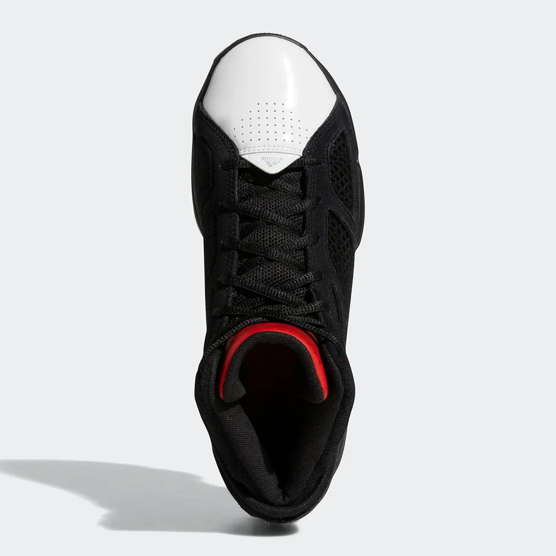On retrouve une empeigne en daim noir, du cuir verni blanc à l’avant de la tige, celle-ci étant complétée par des zones en mesh, en noir et en rouge.