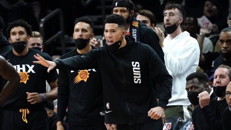 On aurait tort d’oublier que les Suns ont fait tomber les Warriors en étant privés pendant la majorité de la rencontre de Devin Booker. Avec six minutes à jouer en deuxième quart-temps, l’arrière a attaqué le cercle en transition, absorbé un contact anodin d’Otto Porter Jr. puis a dû se tenir le dessous de sa cuisse gauche après la réception.
