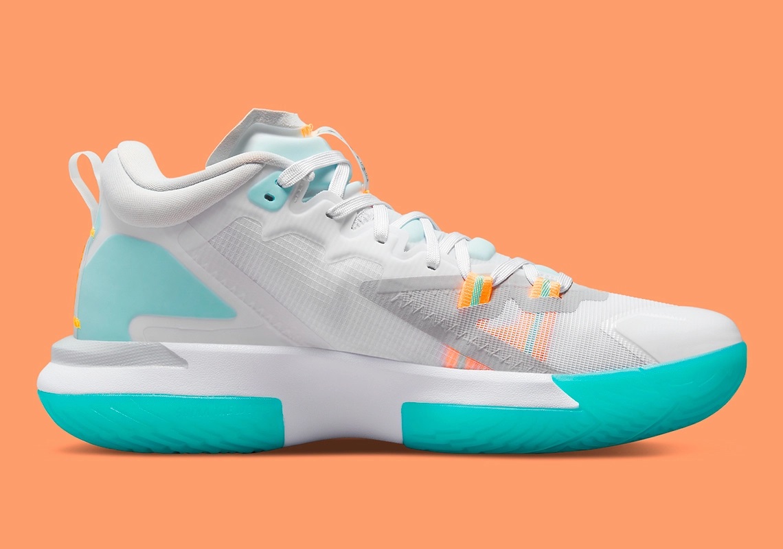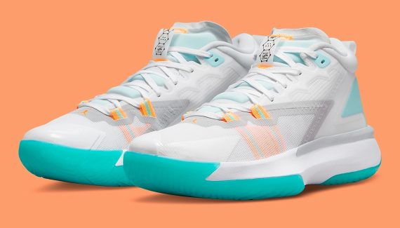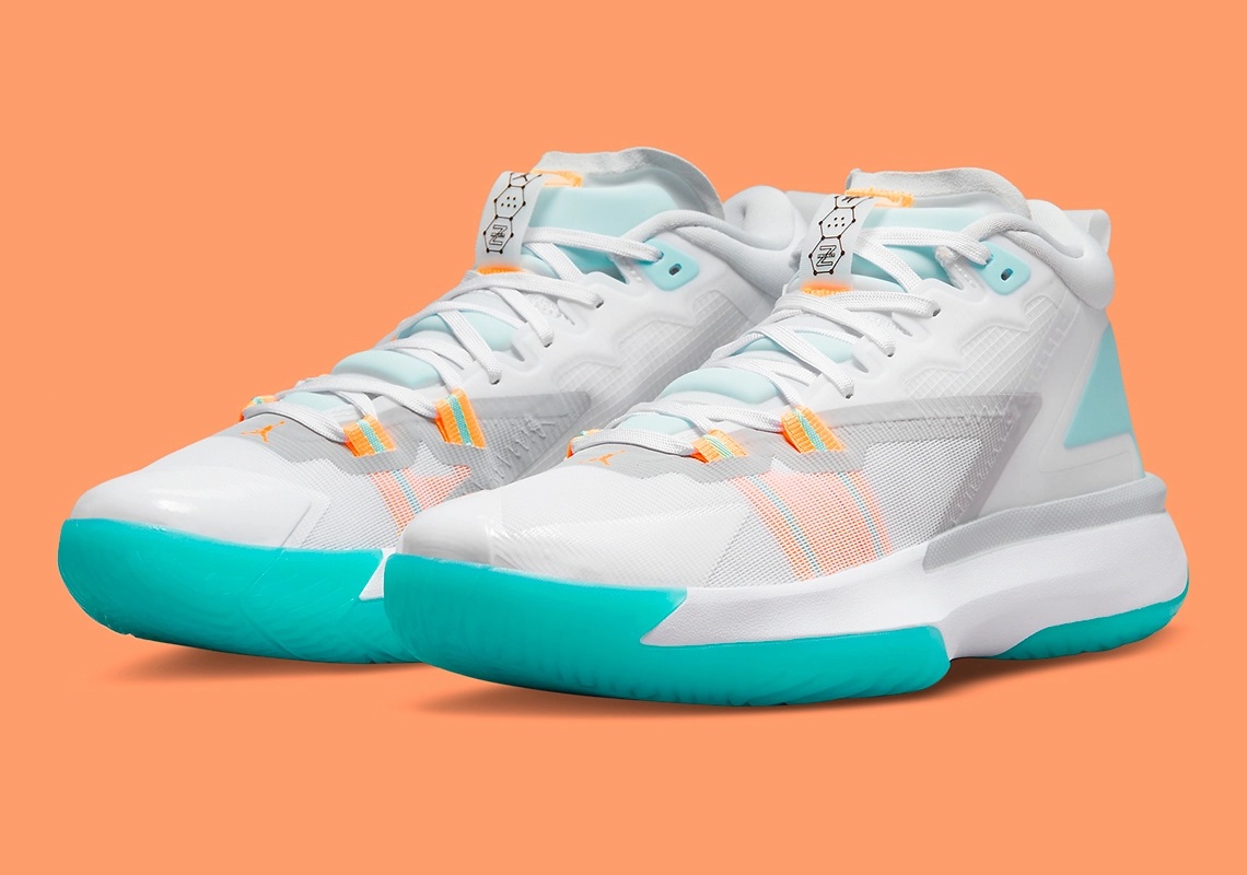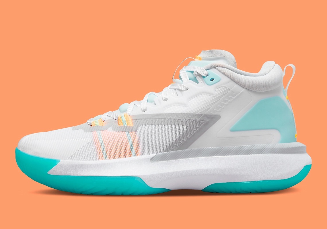 Le nouveau coloris dévoilé présente une version aux tons plutôt légers, avec une tige blanche marquée de légère touches d’orange, et du bleu turquoise à l’arrière de la chaussure et sur la semelle extérieure. La languette présente un schéma d’atomes reprenant notamment le Z de Zion Williamson et le « Jumpman ».