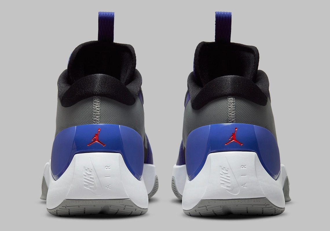 Jordan Brand en est à son quatrième coloris, avec cette fois une version « ultramarine », du nom de ce coloris violet et rouge baptisé ainsi dans les années 80. Sur ce modèle l’ensemble est complété de gris pour habiller l’empeigne et la semelle extérieure. Le rouge est surtout visible sur la semelle intérieure, et les quelques logos et inscriptions présents sur la chaussure, tandis que l’intérieur du col apparaît en noir.