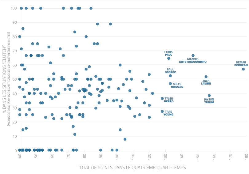 Juste derrière lui au classement des meilleurs marqueurs dans le dernier quart-temps, LeBron James n’est pas aussi efficace avec 7.6 pts à 43% aux tirs et 32% à 3-points, mais aussi un +/- de seulement +0.6. Même chose pour Giannis Antetokounmpo qui complète le podium avec 7.4 points à 55% aux tirs mais 31% à 3-points et 72% aux lancers-francs avec un +/- de +0.9.