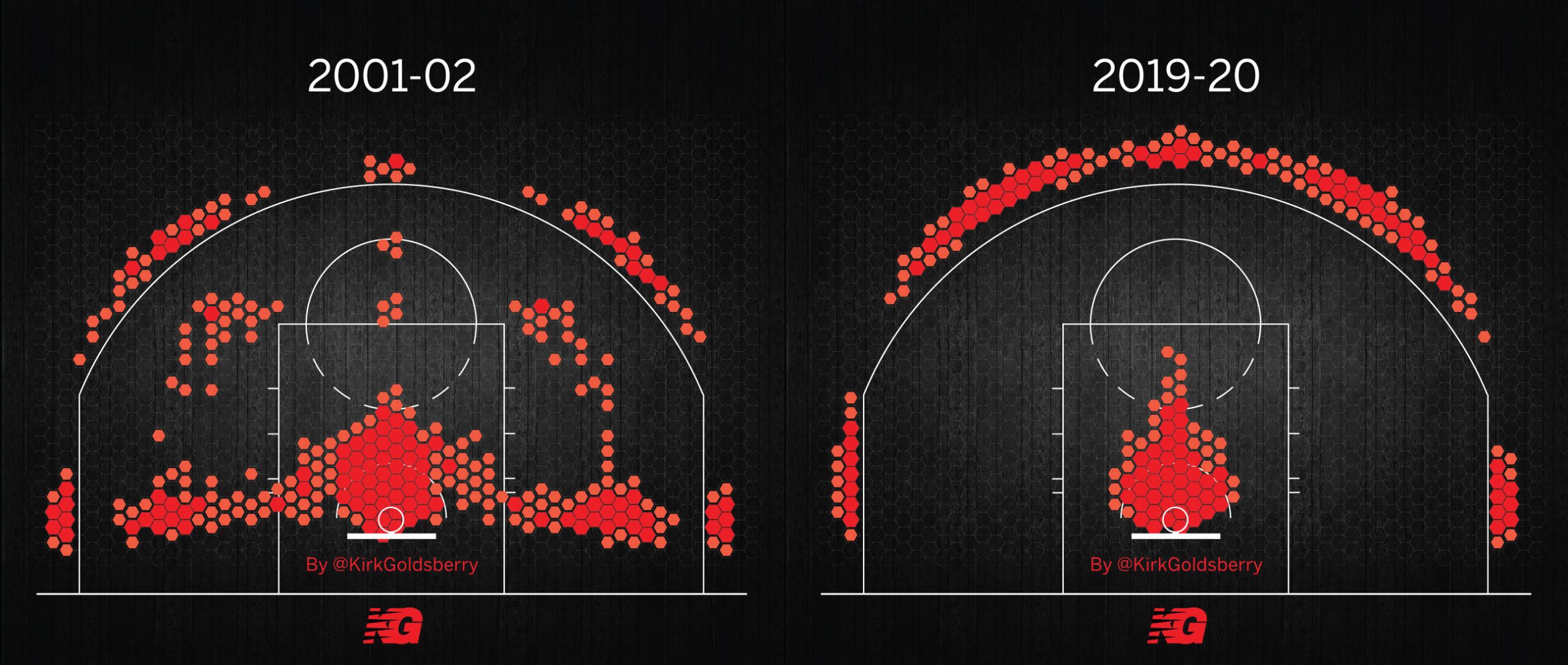 Kirk Goldsberry a très bien illustré ce changement dans le jeu NBA, avec ses cartes de la localisation des tirs. Entre la saison 2001/02 et la saison 2019/20, on voit ainsi parfaitement (lorsqu’on représente le 200 “spots” les plus utilisés) cette stratégie du layup ou du 3-points qui s’est imposée dans toute la ligue.