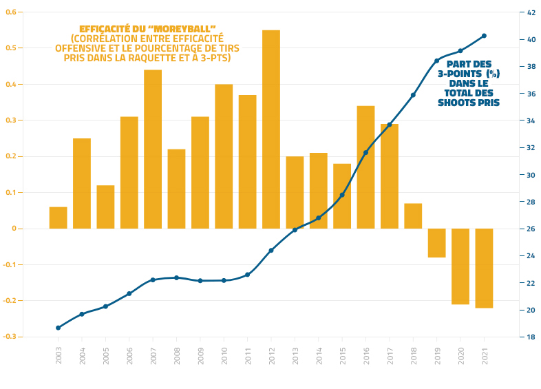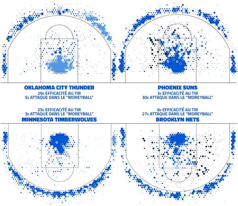 En NBA, tout le monde s’est ainsi mis à courir en appliquant le “Moreyball”, et on a donc atteint un point où certaines des équipes les plus efficaces au tir (Phoenix, Brooklyn…) sont celles qui utilisent le plus le tir à mi-distance, qui semblait pourtant en voie de disparition…