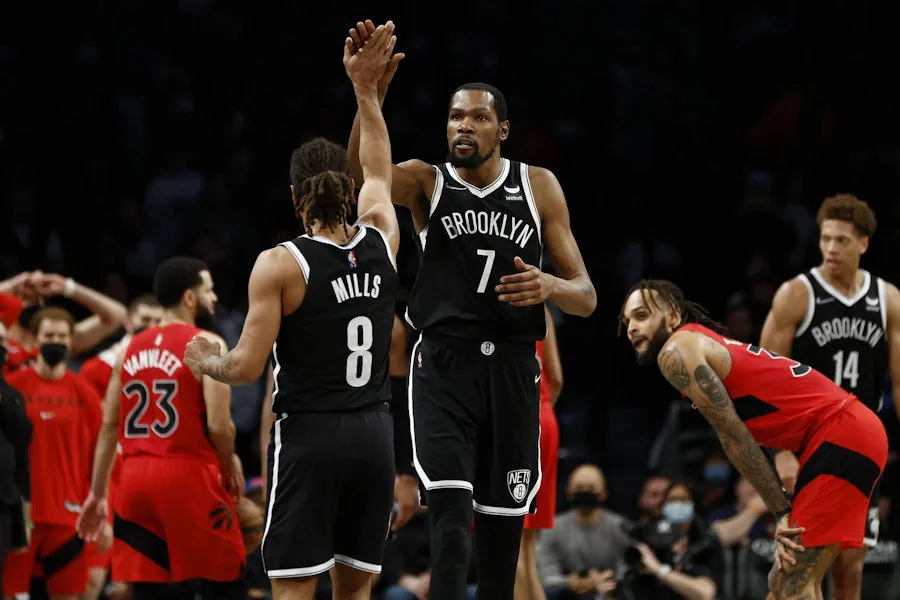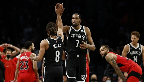 Comme les Bulls, les Nets sont frappés de plein fouet par le Covid-19, et Steve Nash était privé de sept joueurs, dont trois titulaires, pour la réception des Raptors. Incertain, Kevin Durant a finalement tenu sa place, et son 14e triple-double en carrière est nécessaire pour permettre à Brooklyn de s'imposer 131-129 après prolongation.