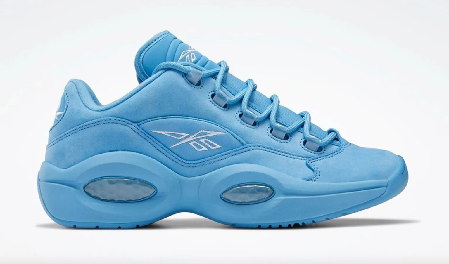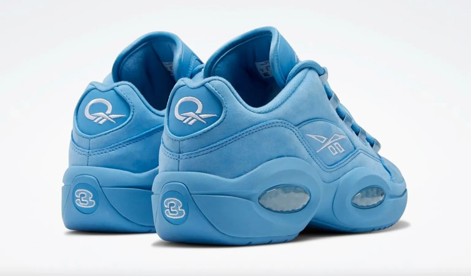 Initialement sortie il y a 25 ans, la « Question » de Reebok est peut-être le modèle le plus décliné du marché. La première paire dessinée pour Allen Iverson va ainsi bénéficier d'un nouveau coloris plutôt flashy, avec un bleu ciel qui ferait presque penser aux couleurs de North Carolina pour recouvrir l'intégralité de la chaussure. Seuls les logos de la marque et le numéro 3 sur le talon ressortent en blanc.