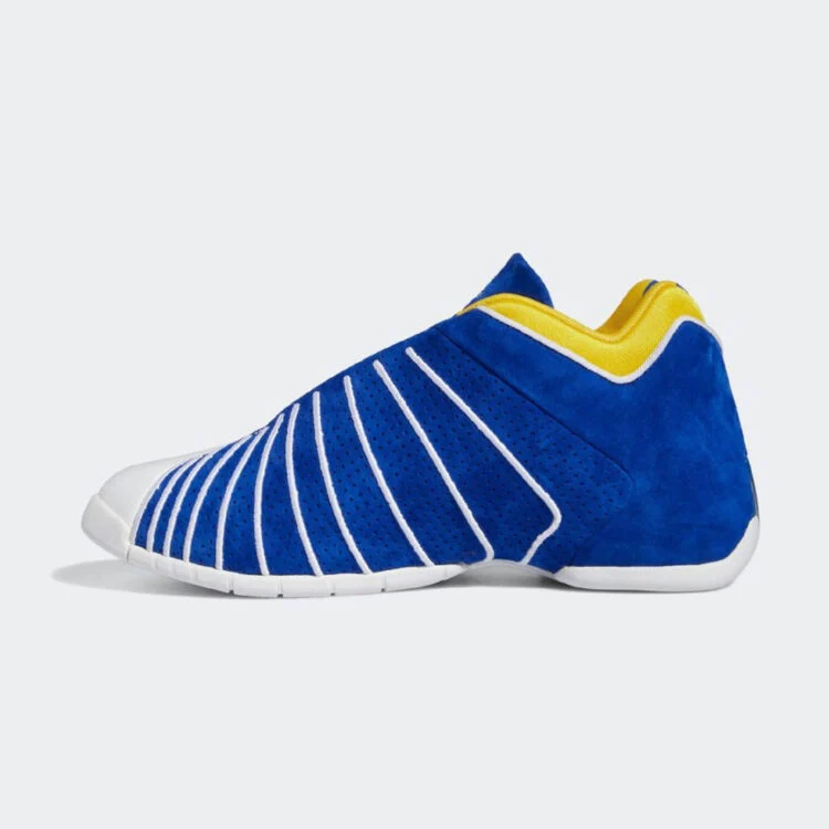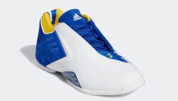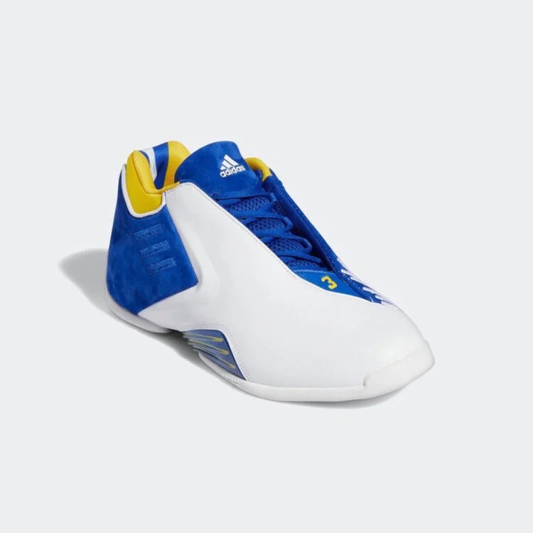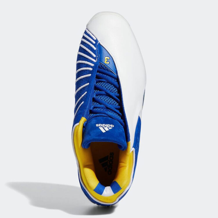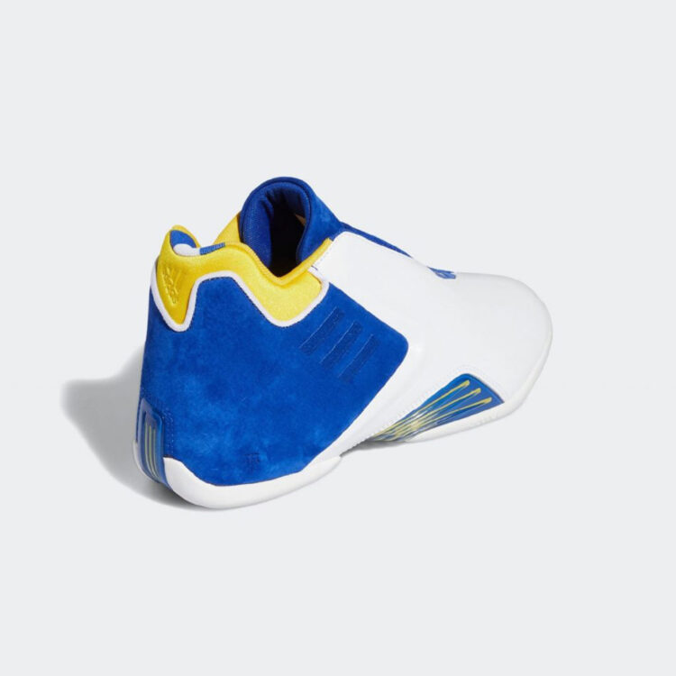 La tige est composée de cuir blanc d’un côté et de daim bleu de l’autre. Le haut du col s’affiche en jaune, tandis que le haut de la languette bleue est elle aussi en daim. Le logo adidas y ressort en blanc. Le numéro 3, porté par Tracy McGrady à cette époque, apparaît en jaune au bas des lacets.