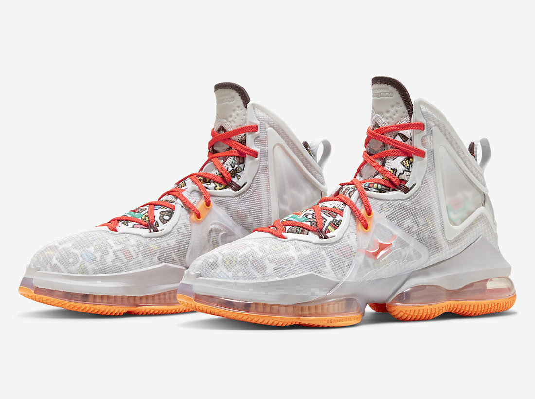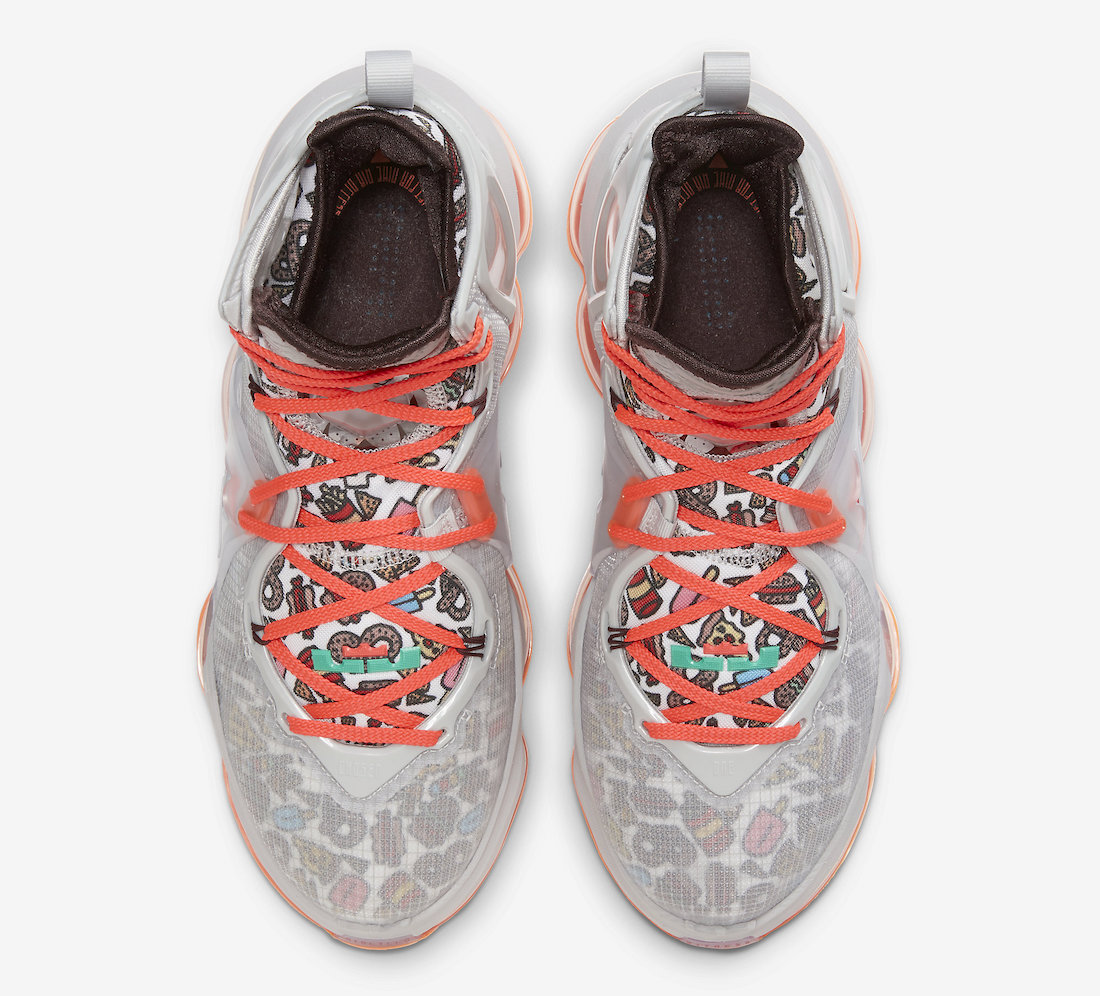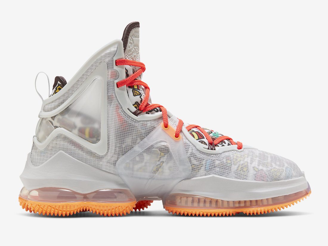 Hamburgers, frites, hot-dogs, pizzas, glaces (et autres… Bretzels !)… toutes « stars » de la « junk food » sont bien présentes sur le dernier coloris de la LeBron 19. Un mélange des genres qui devrait forcément atteindre sa cible d’après Nike qui a donc misé sur ces petits imprimés pour « nourrir » sa tige en néoprène blanc et sa languette.