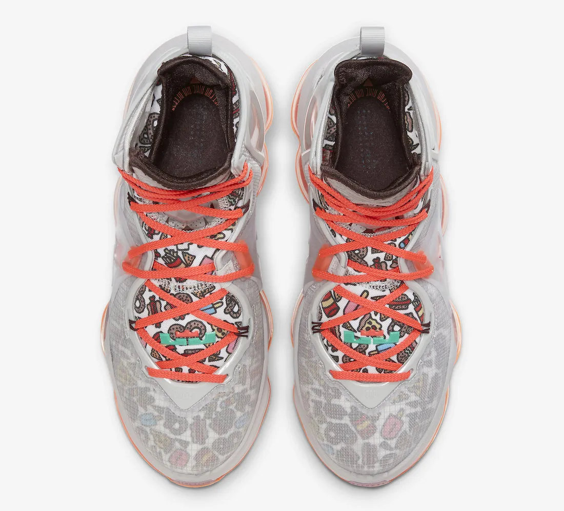 Hamburgers, frites, hot-dogs, pizzas, glaces (et autres… Bretzels !)… toutes « stars » de la « junk food » sont bien présentes sur le dernier coloris de la LeBron 19. Un mélange des genres qui devrait forcément atteindre sa cible d'après Nike qui a donc misé sur ces petits imprimés pour « nourrir » sa tige en néoprène blanc et sa languette.
