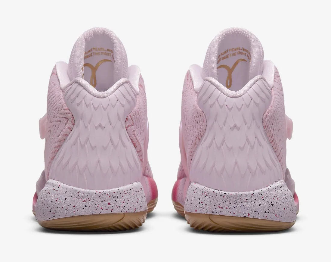 Reposant sur une semelle extérieure en gomme, la semelle intermédiaire présente un dégradé moucheté allant du rose au blanc. Le logo de KD et le prénom de sa tante ressortent en doré sur la languette.