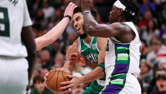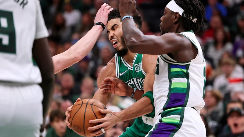 Jayson Tatum venait pourtant de s’enfoncer dans la raquette des Bucks, avec l’espoir d’enchaîner son « spin move ». Mais le meneur des Bucks est venu à la rescousse en mettant ses antennes en opposition.