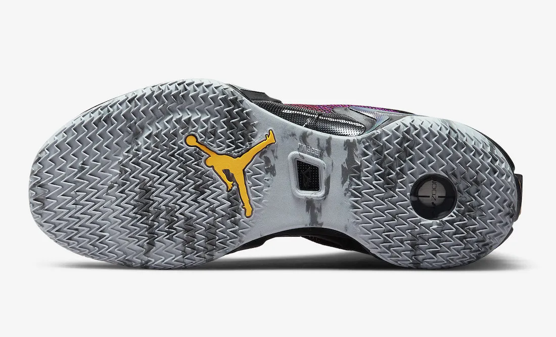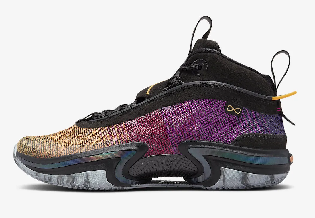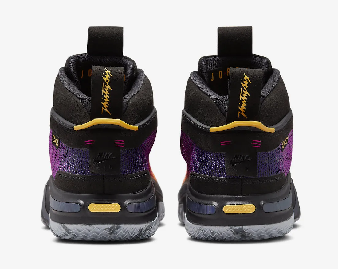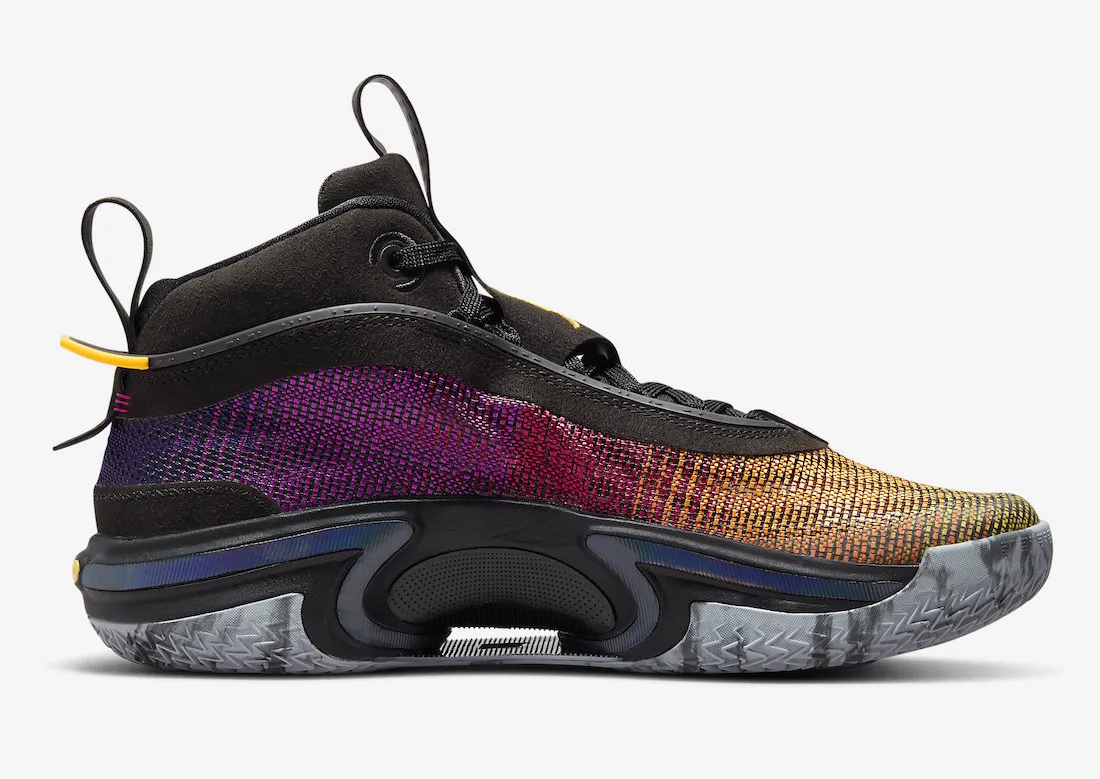 Celui-ci se matérialise au niveau de la tige, recouverte d'un dégradé de couleurs emprunté à celles d'un coucher de soleil. La partie supérieure, la languette et la semelle intermédiaire laissent davantage de place au noir. Les logos « Jumpman » et l'excroissance présente sur le talon ressortent en jaune.