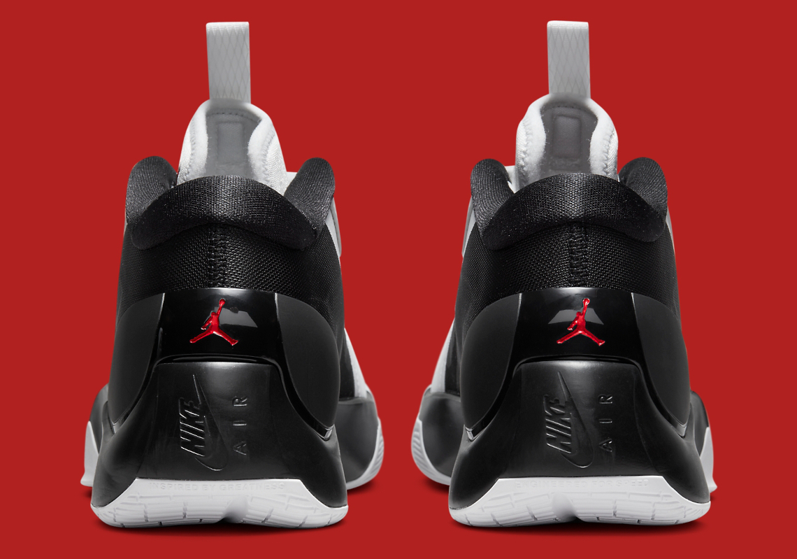 On retrouve un mélange de mesh en noir blanc sur la tige, mixé à des superpositions Fuse et en néoprène sur l’avant du pied et la languette. Des accents de rouge ressortent sur les logo du « Jumpman » sur la languette et le talon.