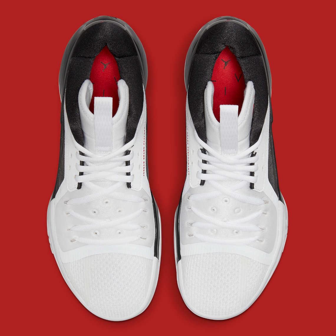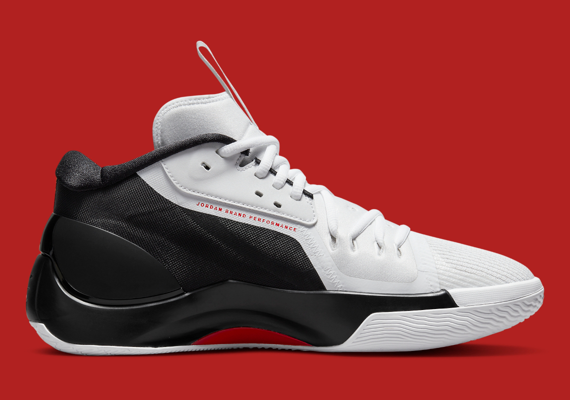 On retrouve un mélange de mesh en noir blanc sur la tige, mixé à des superpositions Fuse et en néoprène sur l’avant du pied et la languette. Des accents de rouge ressortent sur les logo du « Jumpman » sur la languette et le talon.