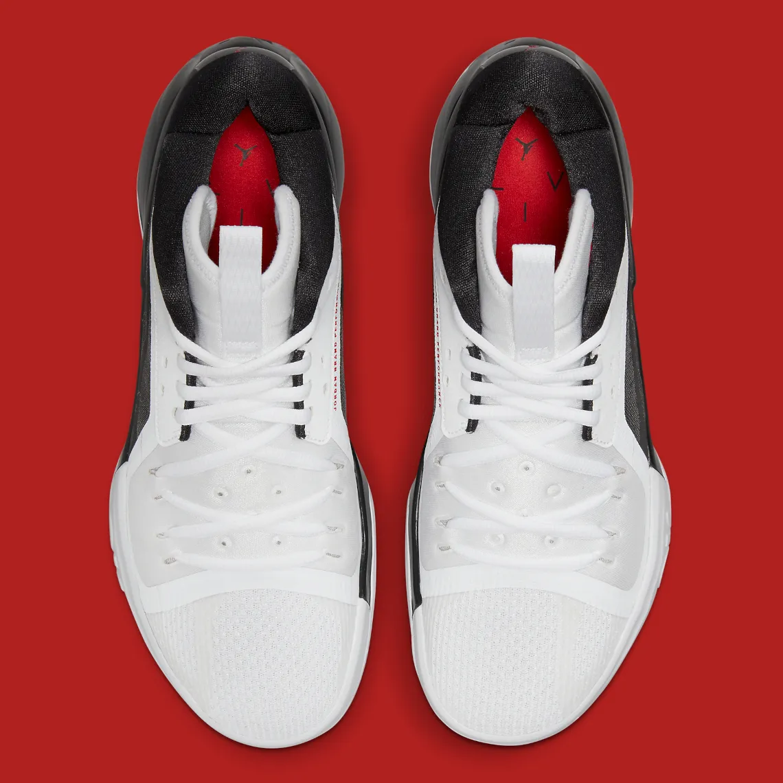 On retrouve un mélange de mesh en noir blanc sur la tige, mixé à des superpositions Fuse et en néoprène sur l'avant du pied et la languette. Des accents de rouge ressortent sur les logo du « Jumpman » sur la languette et le talon.
