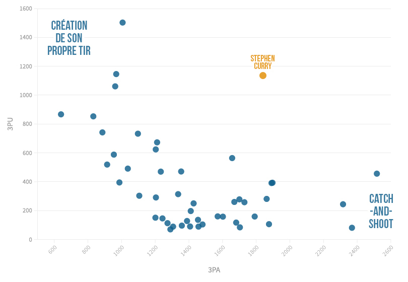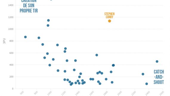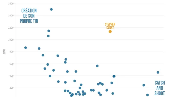 Globalement, il y a trois joueurs qui utilisent le 3-points en sortie de dribble de façon systématique ces dernières saisons en NBA : Stephen Curry donc, mais également James Harden et Damian Lillard. Mais les saisons du meneur de Golden State sont largement les plus efficaces des trois sur ces tirs où il se crée lui-même son tir.