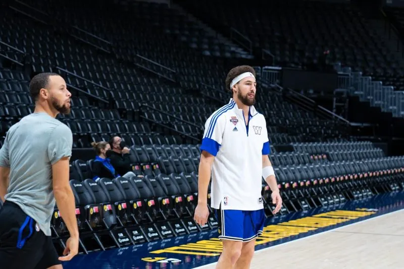 Sans Draymond Green donc, coincé dans le protocole sanitaire de la ligue, mais aux côtés de Stephen Curry et Andre Iguodala, Klay Thompson a pu retrouver certaines de ses petites habitudes à l'entraînement. Notamment lorsque les “Splash Brothers” se sont adonnés à une petite séance de shoot sur le parquet de la Ball Arena.