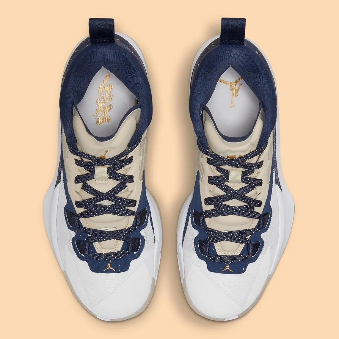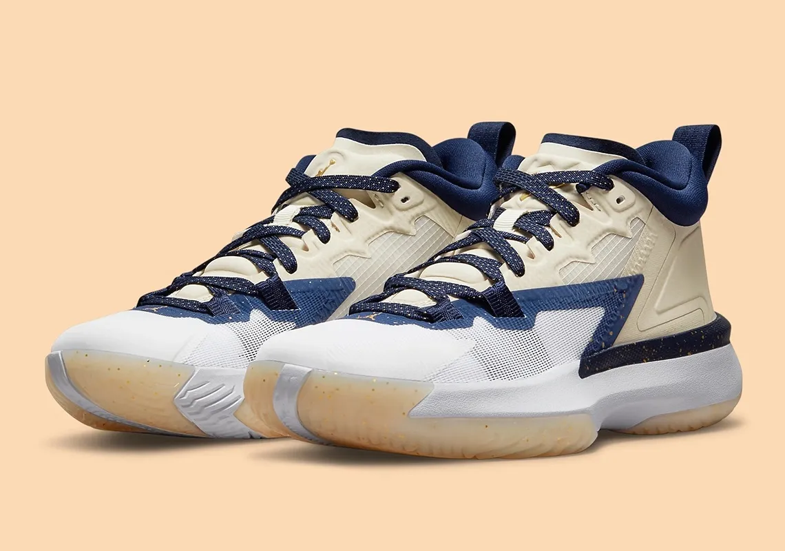 Le retour de Zion Williamson se fait toujours attendre. Pour patienter, Jordan Brand a dévoilé un nouveau coloris de la Zion 1 qu'on qualifiera de sobre mais efficace. La tige, traversée par un Z en bleu marine sur l'empeigne, est principalement en blanc cassé et blanc. Des touches dorées viennent compléter la paire, sur les logos Jumpman et de Zion Williamson notamment.