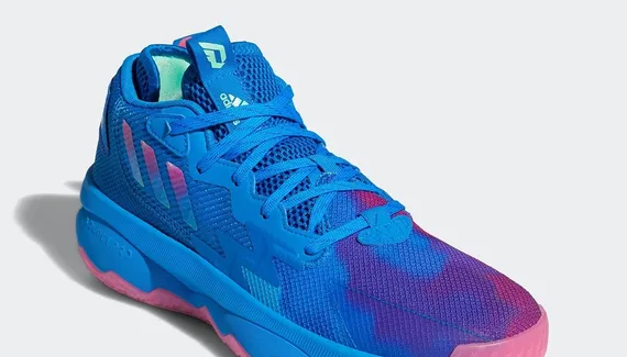 La Dame 8 est mise en valeur avec ce coloris bleu et rose, sur la tige et la semelle, allant jusqu'à des touches de bordeaux et de violet à l'avant. L'inscription “Dame” sur l'empeigne et “Battle of the Bubble” sur le talon ressortent en bleu clair.