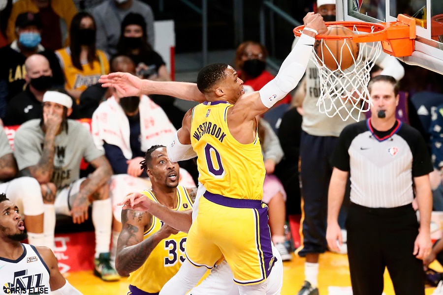 Toute la rage et la frustration de Russell Westbrook se retrouvent dans ce dunk monstrueux ! Le meneur des Lakers prend l’intervalle et ses deux fusées lui permettent de décoller pour posterizer Rudy Gobert. L’ancien Staples Center explose, et Russell Westbrook a retrouvé toute son énergie et sa puissance.