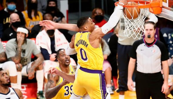 Toute la rage et la frustration de Russell Westbrook se retrouvent dans ce dunk monstrueux ! Le meneur des Lakers prend l’intervalle et ses deux fusées lui permettent de décoller pour posterizer Rudy Gobert. L’ancien Staples Center explose, et Russell Westbrook a retrouvé toute son énergie et sa puissance.