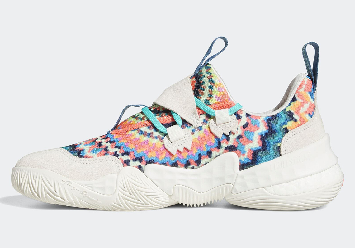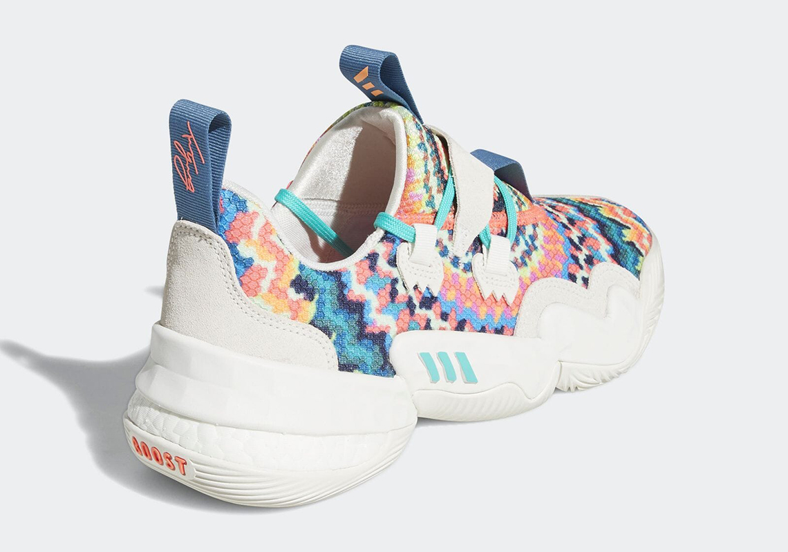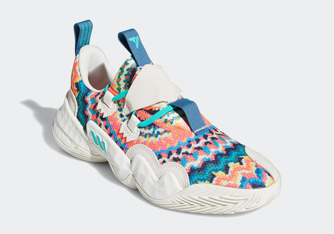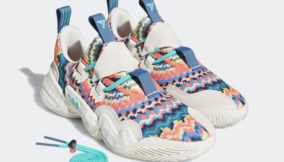 Le « Tie-Dye » est de retour à la mode et la Trae Young 1 se plie à la tendance avec un nouveau coloris du même nom qui reprend donc l’imprimé multicolore popularisé dans les années 70 pour habiller sa tige, également recouverte de bandes en blanc cassé.