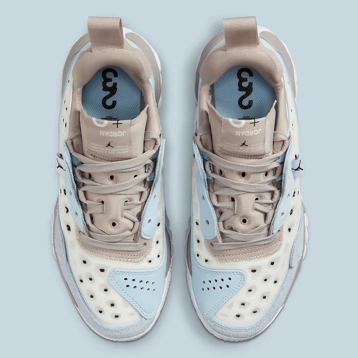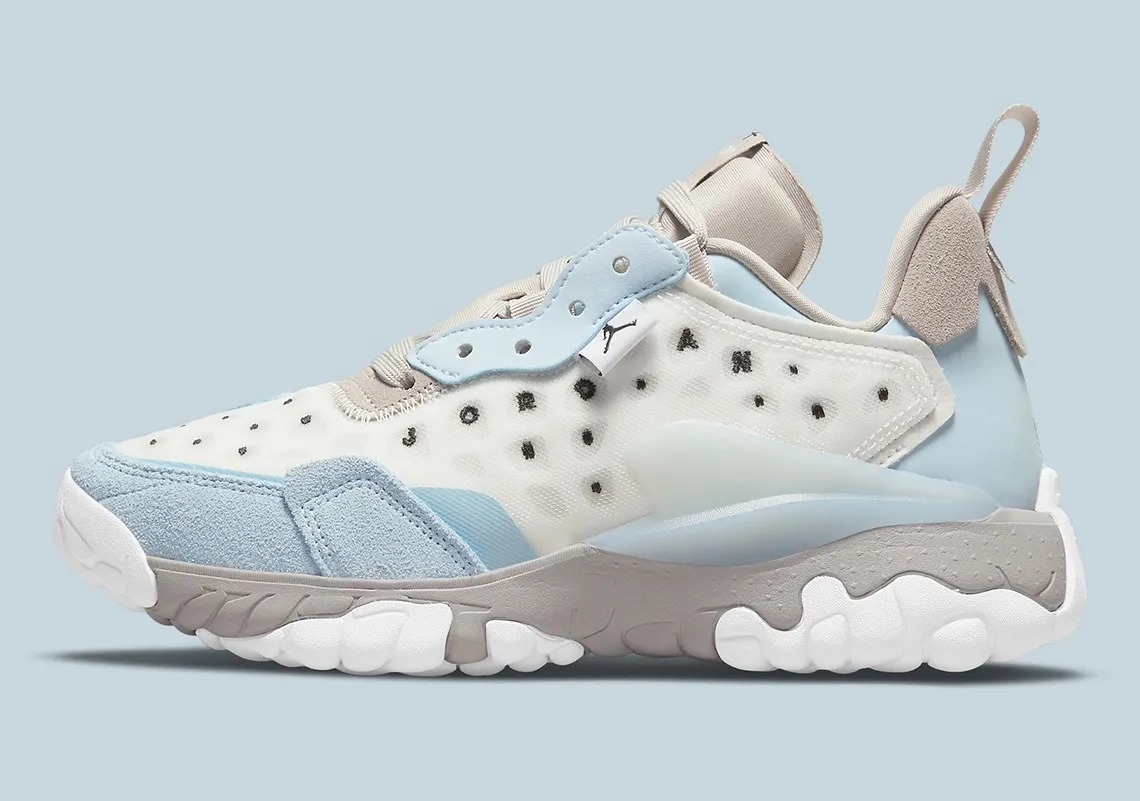 Les touches de bleu clair sont présentes sur les contours des œillets, le talon et l'avant de la chaussure, en daim de qualité supérieure. Le reste de la tige est blanche, avec des points noirs, dont l'inscription « Jordan » sur l'empeigne. Les lacets, la languette et le haut du talon sont en gris. Le gris et le blanc se mélangent également sur la semelle, donnant à l'ensemble un modèle plutôt attrayant.
