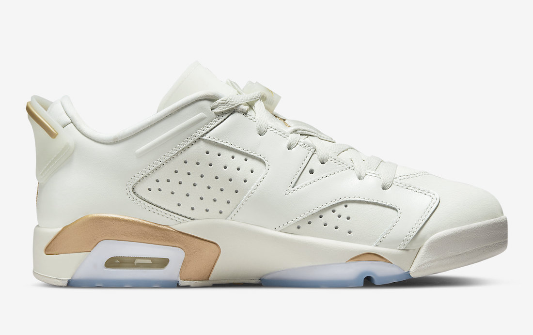 Cette année, c’est une nouvelle version Low mais de la Air Jordan 6 qui va investir le marché. Le modèle est habillé d’une tige en blanc cassé rehaussé par des touches dorées sur la semelle intermédiaire, et les logos « Jumpman » présents sur la languette, le talon et sous la semelle. L’ensemble repose sur une semelle translucide glacée.