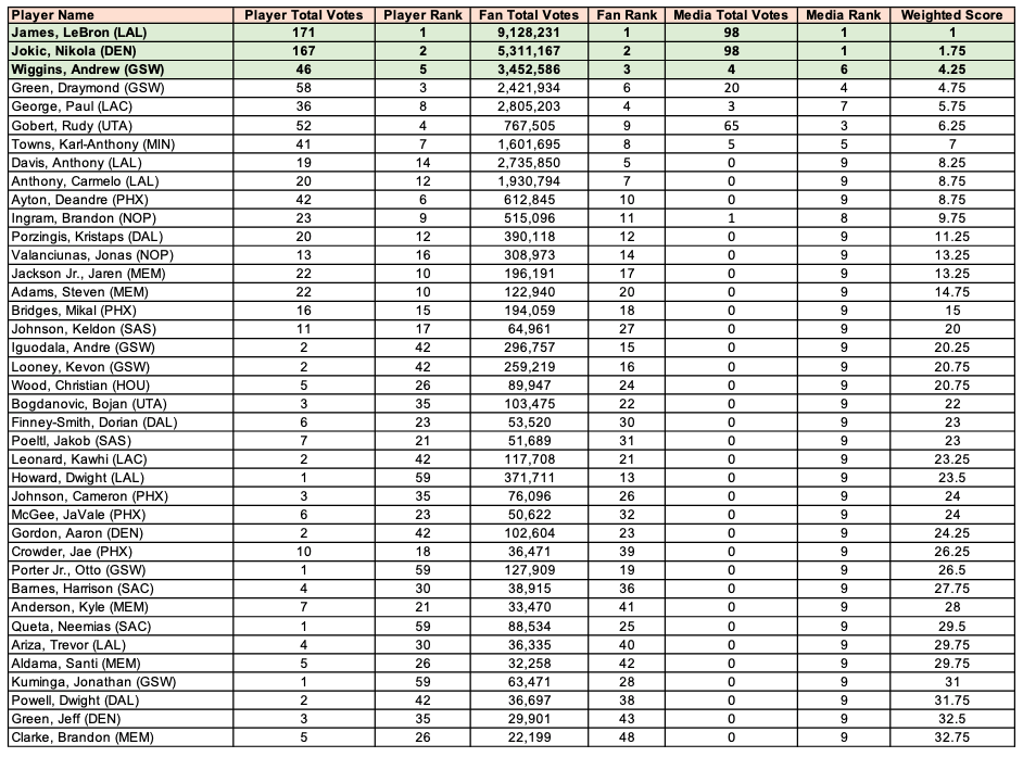 En fait, c’est donc le vote du public, où il finit 3e, et qui compte pour 50% du choix, qui a propulsé Andrew Wiggins au prochain match des étoiles, avec 3 452 586 voix, collectés sur l’application NBA ou sur Twitter.