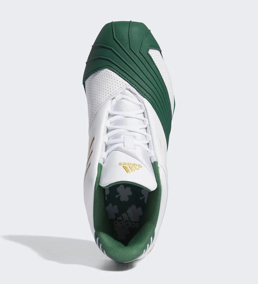 Un modèle qui reprend donc le code couleur vert, blanc et or La tige est en cuir blanc, enveloppée d'une couche synthétique vert à l'avant. La partie en cuir sur le talon ressort également en vert et blanc, tandis que la semelle extérieure est en caoutchouc vert. Les touches dorées sont visibles sur les contours des trois bandes, le logo adidas sur le talon et la pastille contenant le numéro 23.