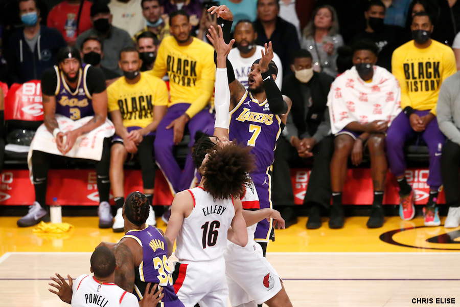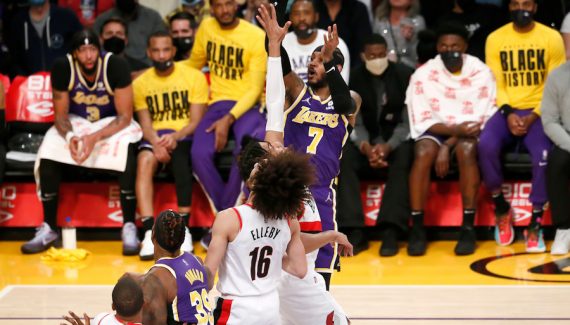 Après trois défaites de suite, les Lakers renouent avec le succès en s’imposant 99-94 face aux Blazers pour leurs retrouvailles avec leur public. Comme prévu, LeBron James n’est pas là, mais ses coéquipiers ont pris le match par le bon bout avec Anthony Davis à la finition, Russell Westbrook pour la création, et surtout Carmelo Anthony, rapidement entré en jeu. Le vétéran est servi idéalement, et c’est lui qui fait la différence en premier quart-temps (28-16).